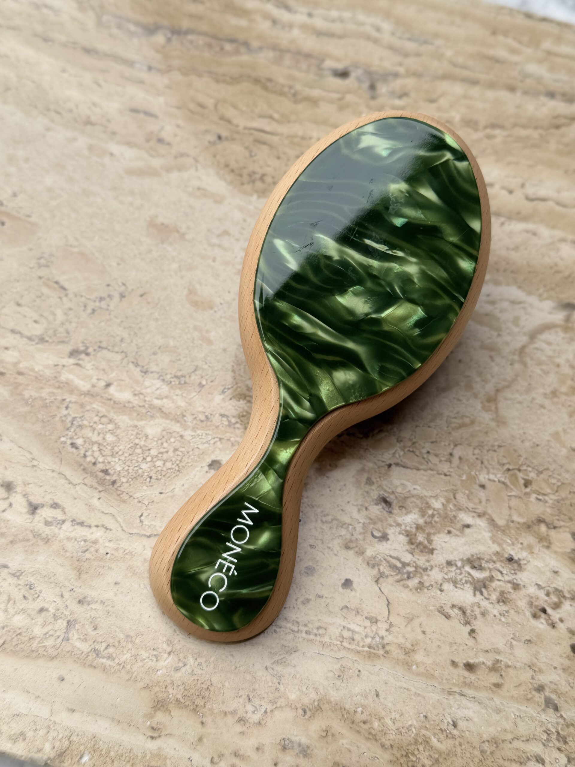 Small bamboo hair brush, 100% cellulose acetate and boar hair. Compact size handy for handbag and while traveling. Suitable for all hair types, easily and gently combs dry and wet hair of any length. Gently removes knots and tangles, creating an optimal environment for the growth of strong, healthy hair. Suitable for diffusing hair care products. Always comb through your hair, starting from the ends to the root. Use the brush in the morning to detangle and style your hair, and apply an even coat of oil or serum before bed to wake up with softer, shinier hair. We recommend using a wet hair comb. With the small brush, you can easily clean the hairs between the prongs. Invest in care.