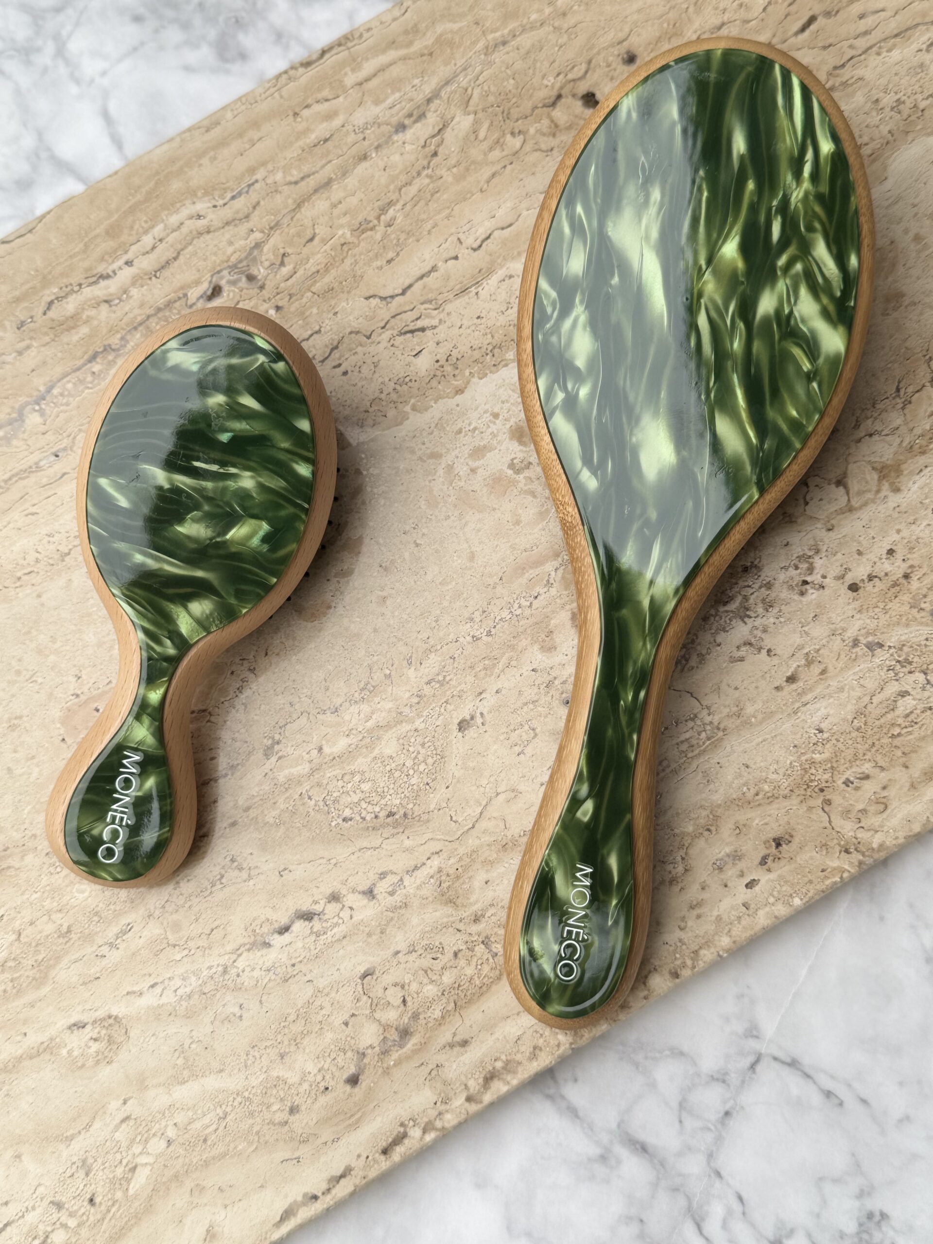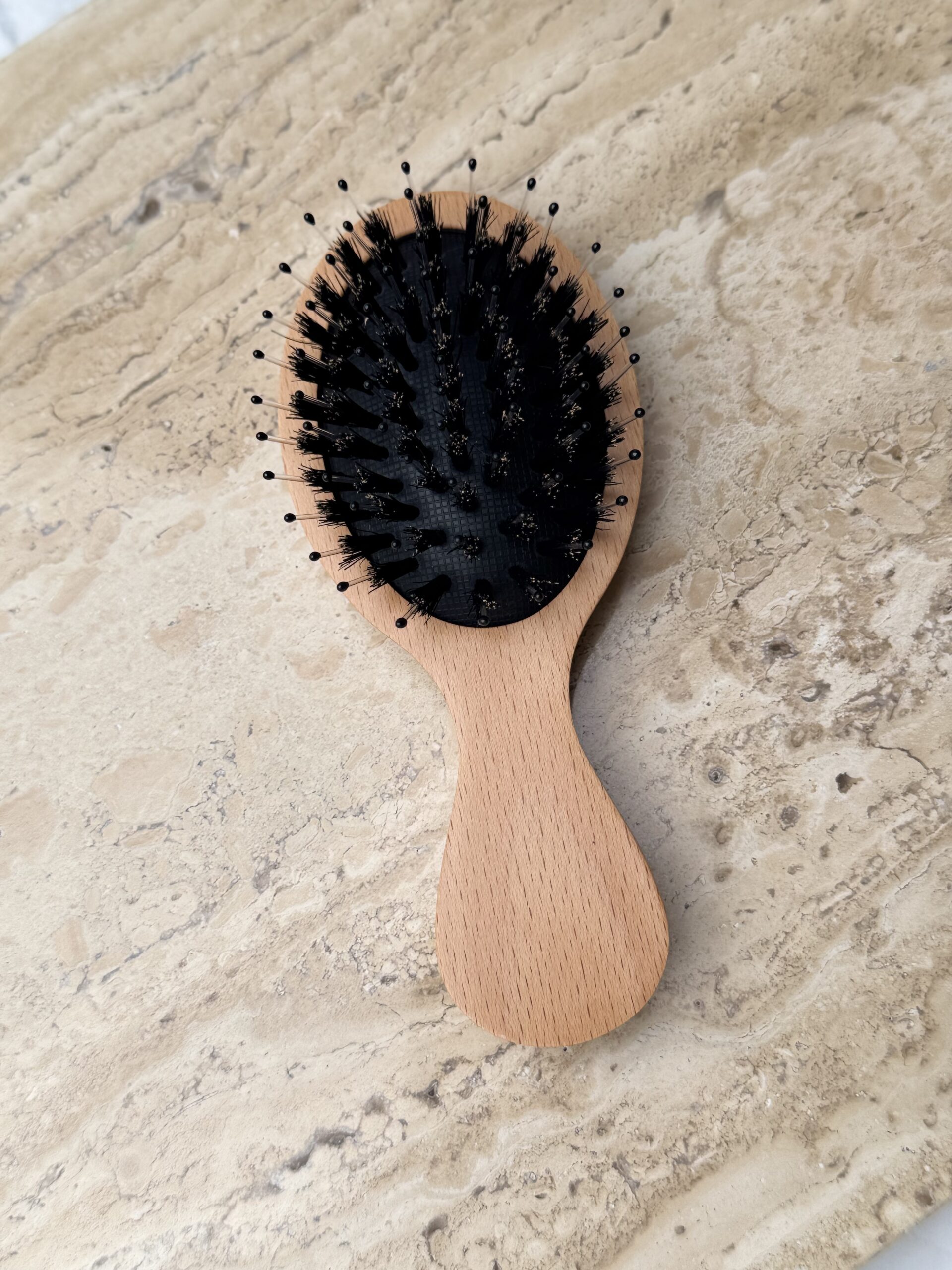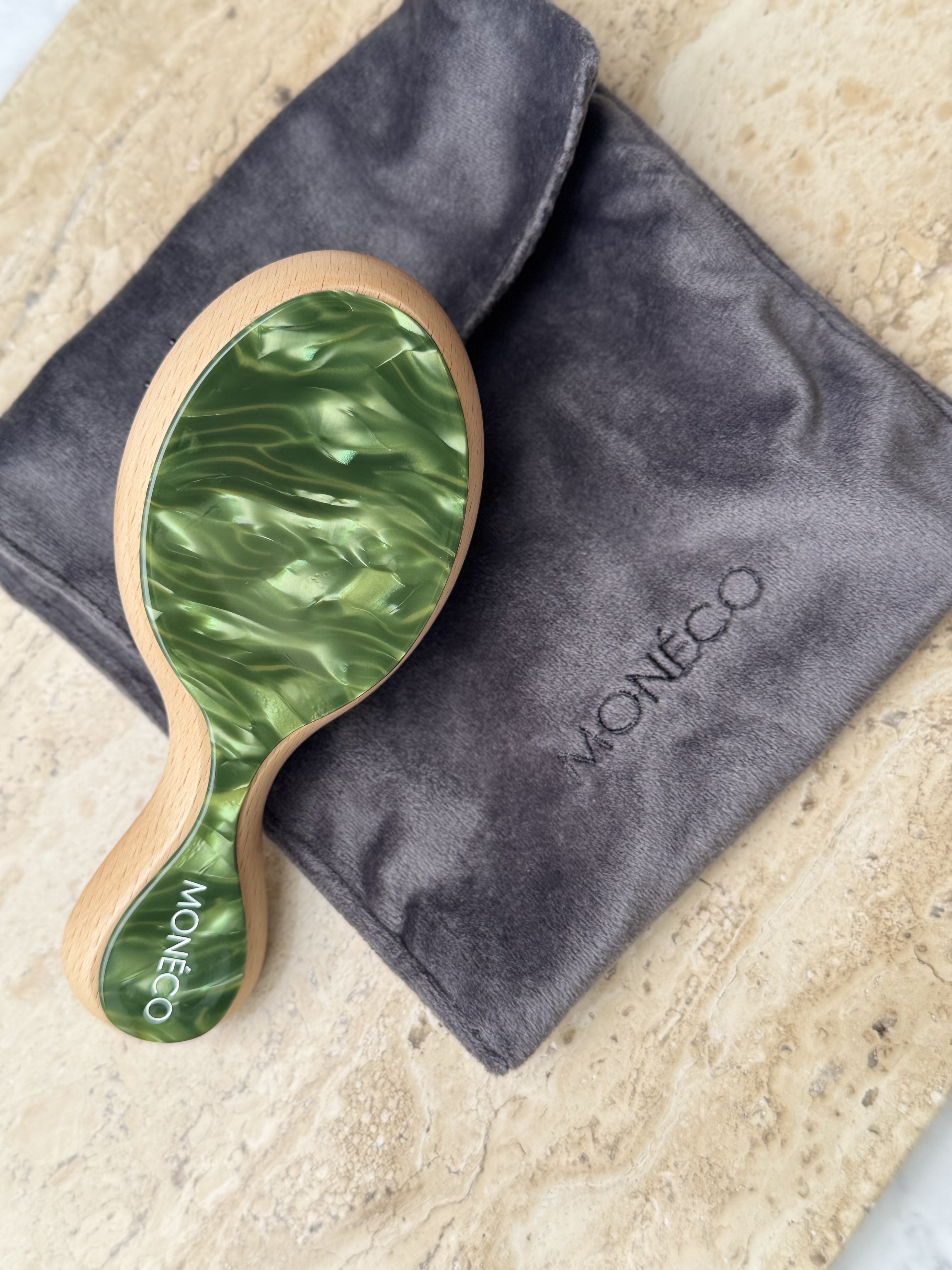 Small bamboo hair brush, 100% cellulose acetate and boar hair. Compact size handy for handbag and while traveling. Suitable for all hair types, easily and gently combs dry and wet hair of any length. Gently removes knots and tangles, creating an optimal environment for the growth of strong, healthy hair. Suitable for diffusing hair care products. Always comb through your hair, starting from the ends to the root. Use the brush in the morning to detangle and style your hair, and apply an even coat of oil or serum before bed to wake up with softer, shinier hair. We recommend using a wet hair comb. With the small brush, you can easily clean the hairs between the prongs, and with the storage bag, you can carry it in your handbag. Invest in care.