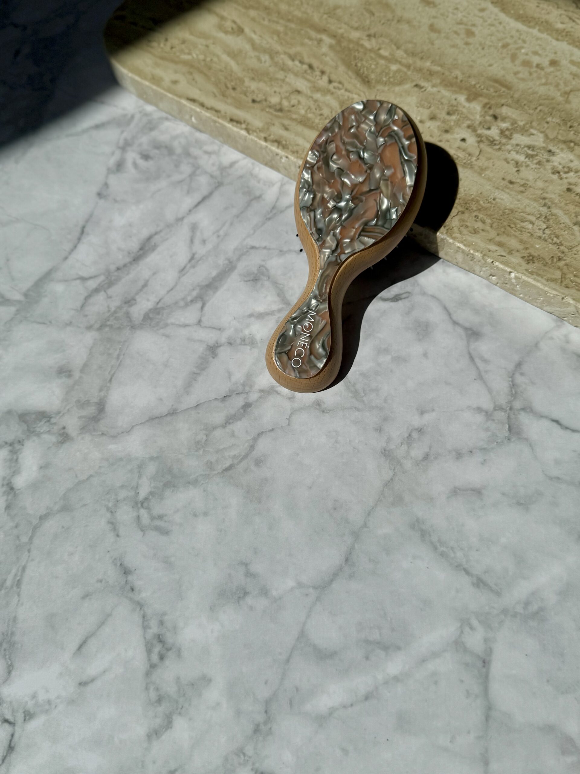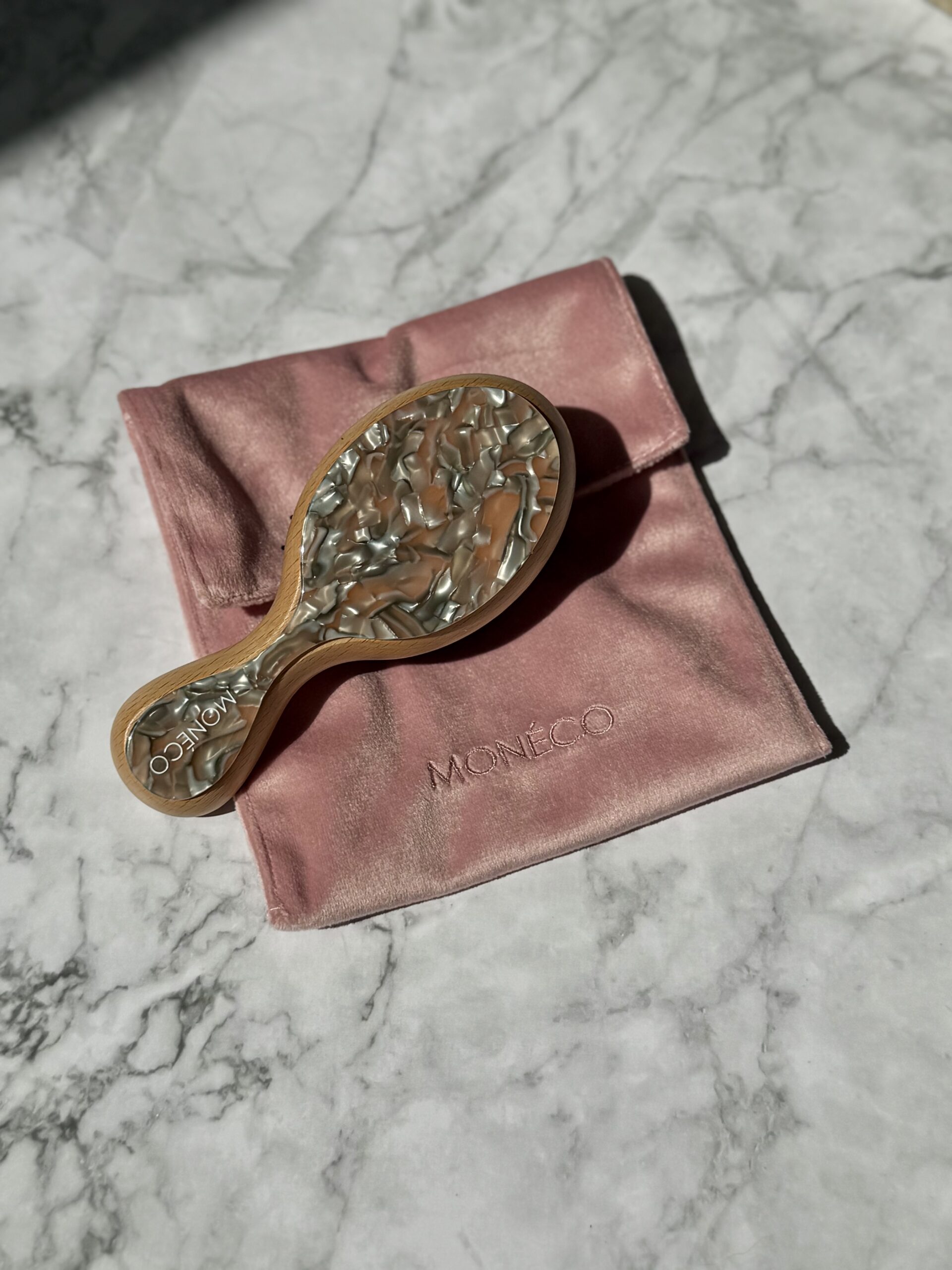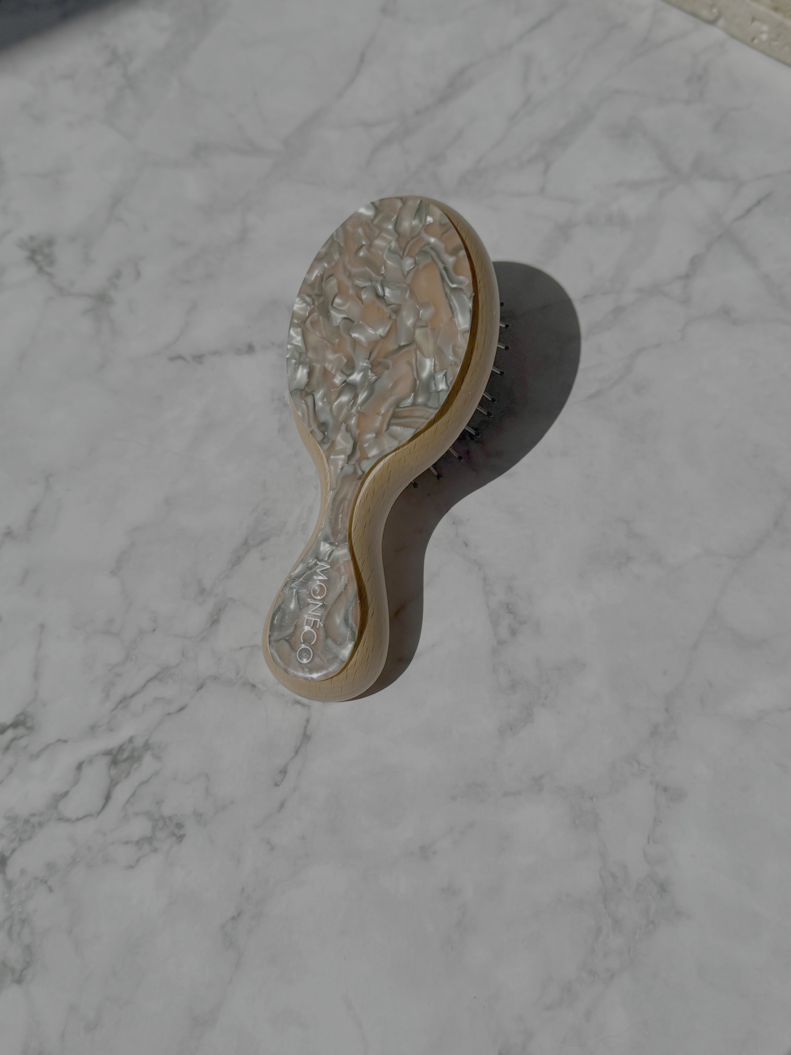Small bamboo hair brush, 100% cellulose acetate and boar hair. Compact size handy for handbag and while traveling. Suitable for all hair types, easily and gently combs dry and wet hair of any length. Gently removes knots and tangles, creating an optimal environment for the growth of strong, healthy hair. Suitable for diffusing hair care products. Always comb through your hair, starting from the ends to the root. Use the brush in the morning to detangle and style your hair, and apply an even coat of oil or serum before bed to wake up with softer, shinier hair. We recommend using a wet hair comb. With the small brush, you can easily clean the hairs between the prongs, and with the storage bag, you can carry it in your handbag. Invest in care.