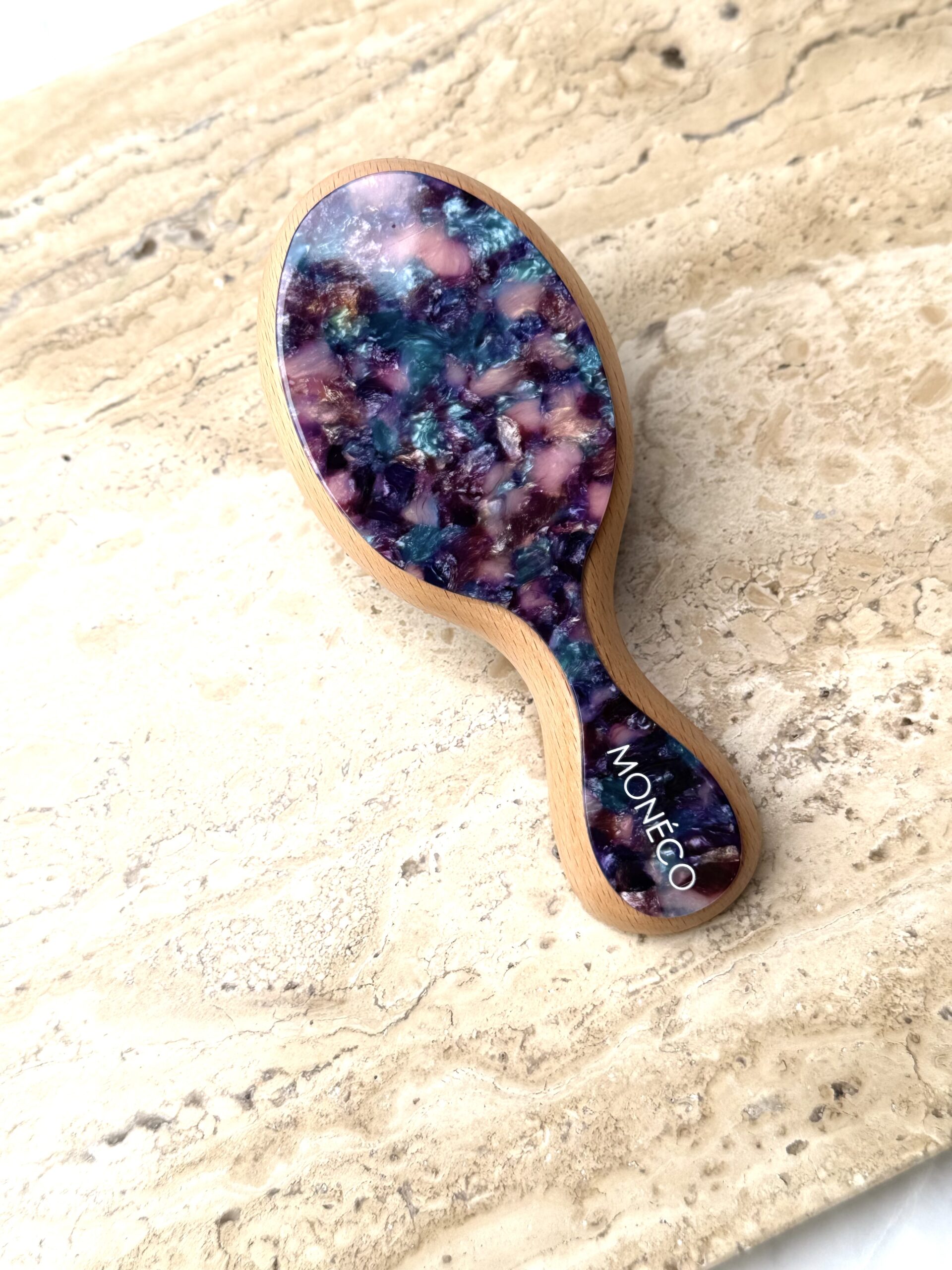 Малка четка за коса от бамбук, 100% целулозен ацетат и косми от глиган. Компактен размер удобен за дамската чанта и по време на пътуване. Подходяща за всички типове коса, лесно и щадящо разресва суха и влажна коса с всякаква дължина. Нежно премахва възли и заплитания, създавайки оптимална среда за растеж на силна, здрава коса. Подходяща за разнасяне на козметика за коса. Винаги разресвайте Вашата коса, като започнете от краищата към корена. Използвайте четката сутрин, за да разплетете и оформите Вашата коса, а преди лягане да нанесете равномерно олио или серум, за да се събудите с по-мека, по-блестяща коса. Препоръчваме използването на гребен за мокра коса. С малката четка лесно можете да почистите космите между зъбците. Инвестирайте в грижа.