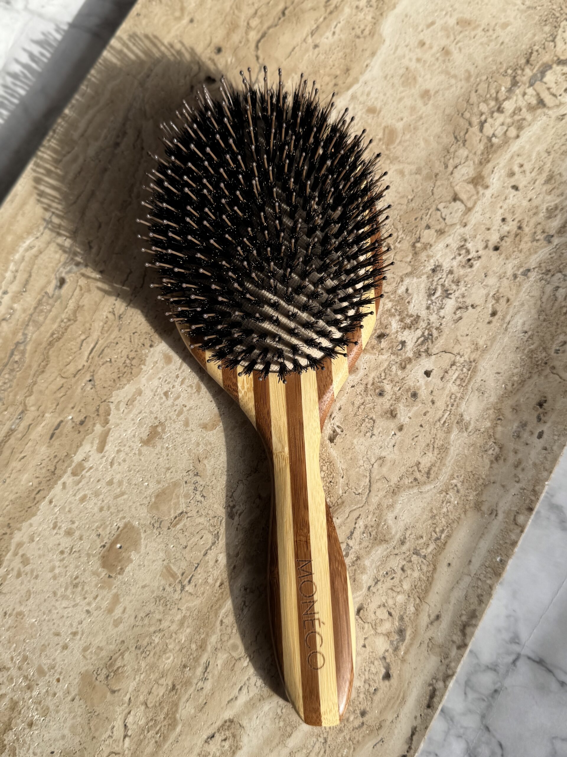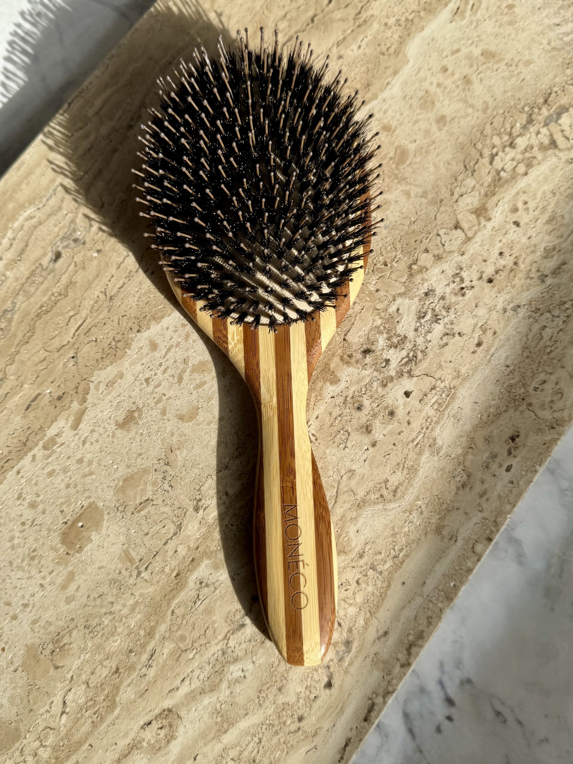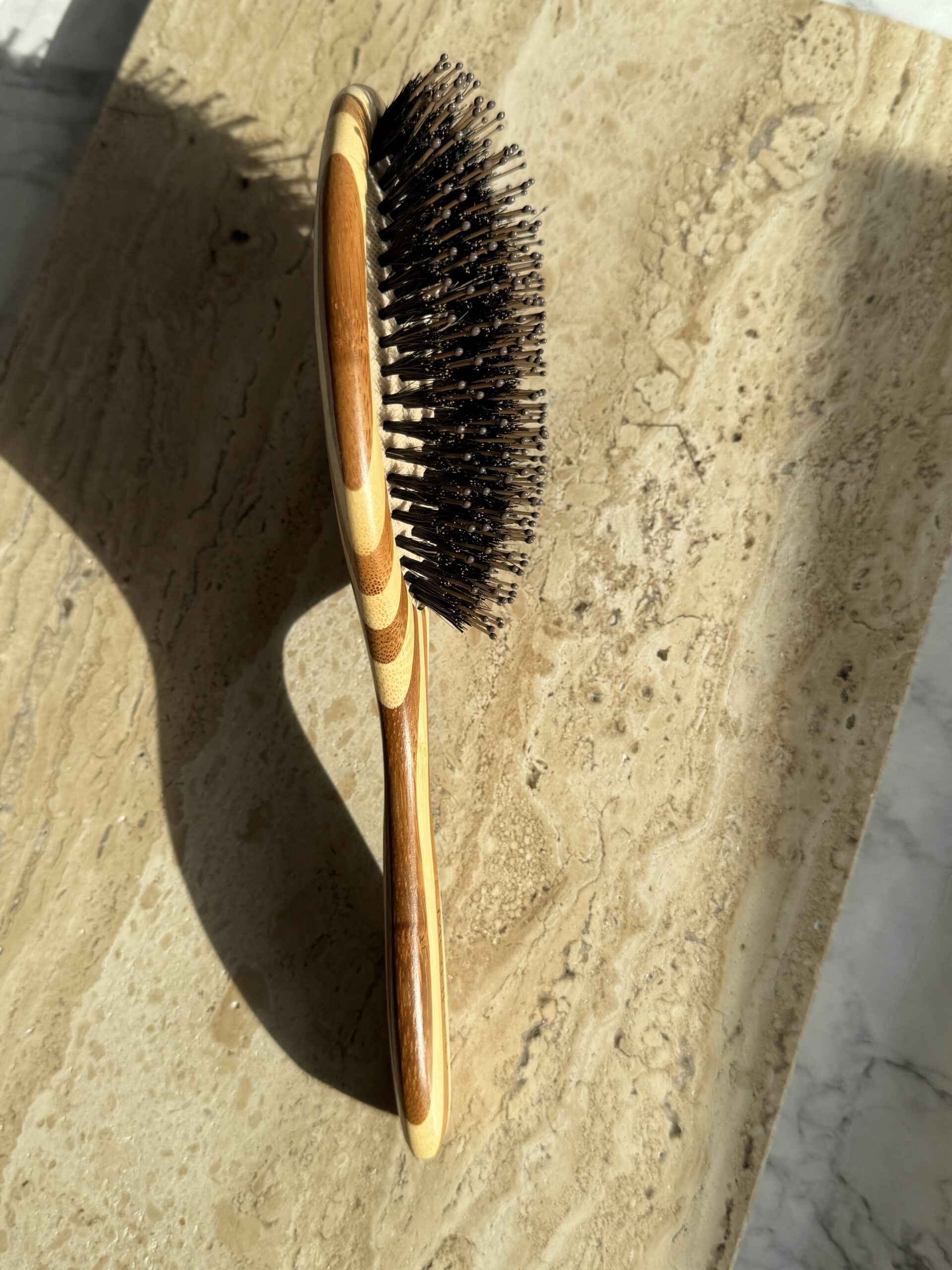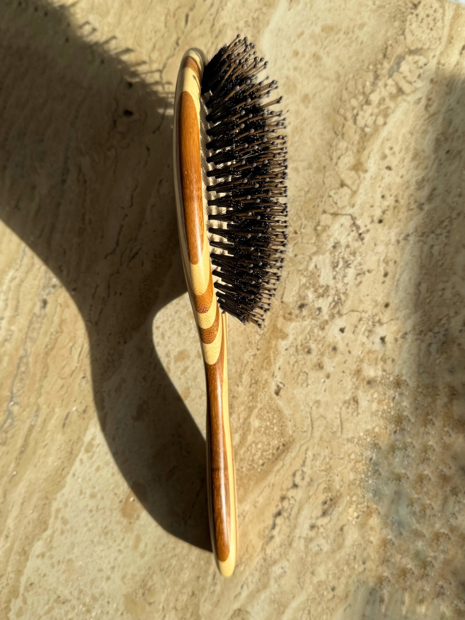 Деревянная расческа с кабаньим волосом и пластиковыми зубчиками.